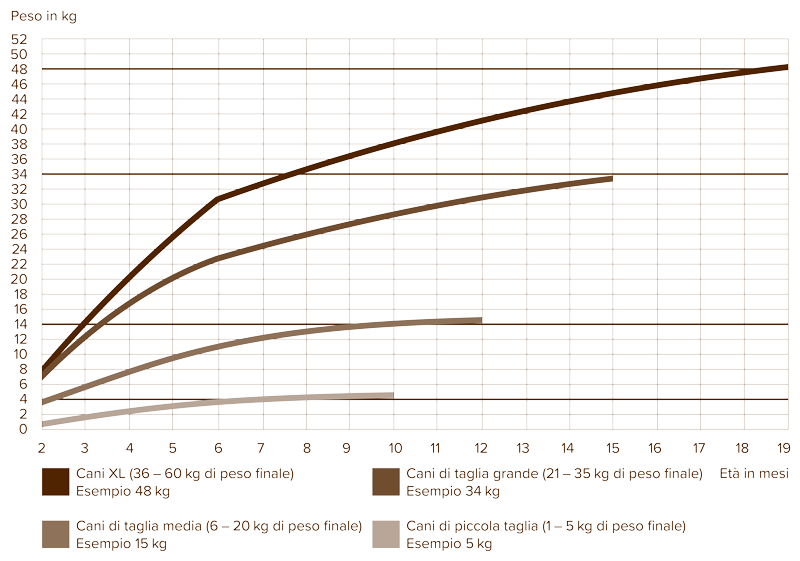 Non si deve nutrire un cane con cibo per cani adulti fino a quando il cane non è completamente cresciuto. Le razze piccole sono completamente sviluppate a circa 10 mesi di età, le razze medie a 12 mesi e le razze grandi e giganti a circa 18-24 mesi. Nel primo semestre si verifica il maggior aumento di peso e di dimensioni. Per informazioni più dettagliate, chiedi all'allevatore o all'associazione della razza le fasi di crescita del giovane cane.